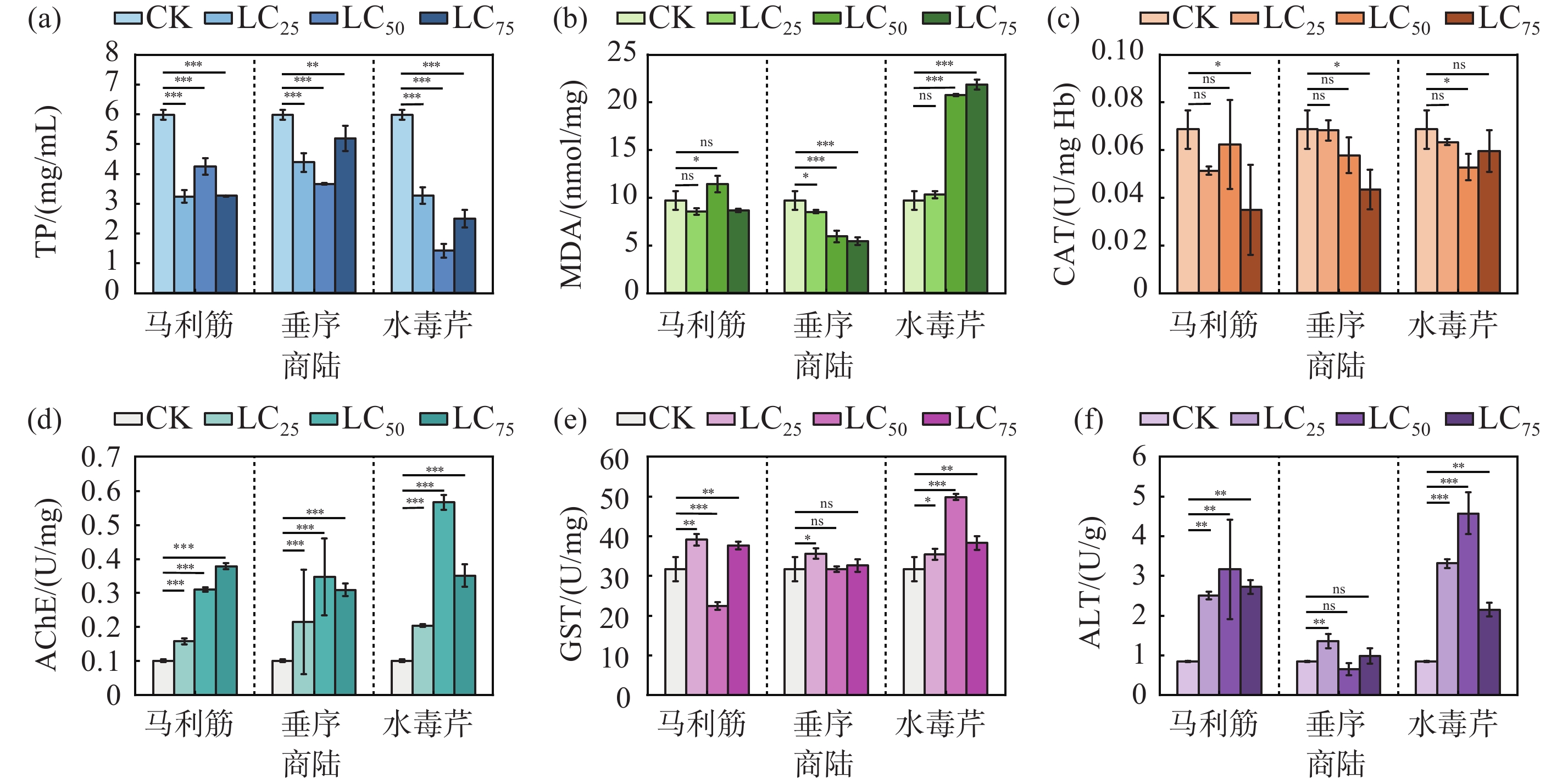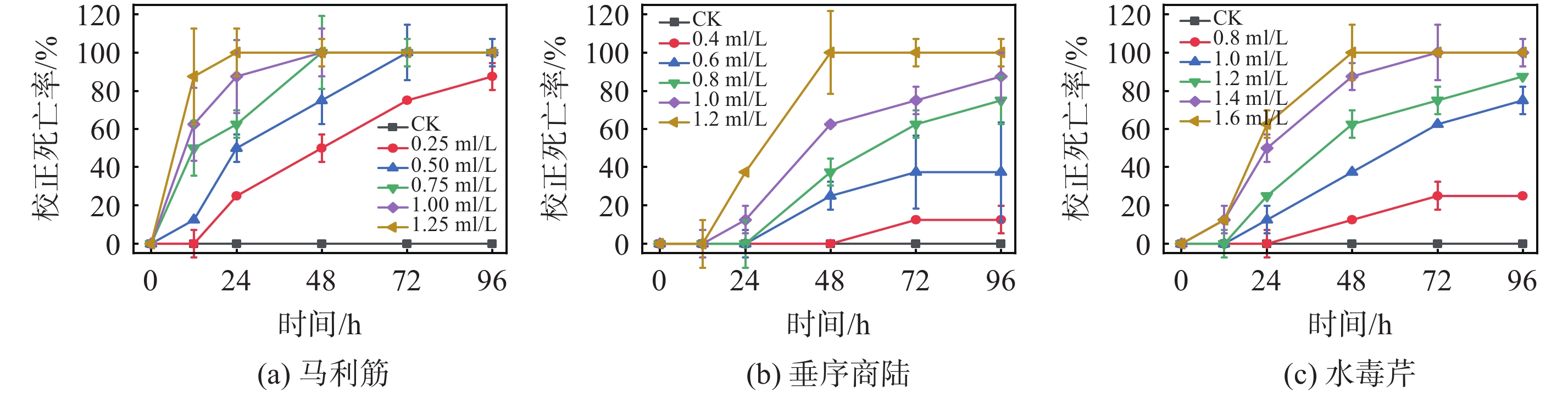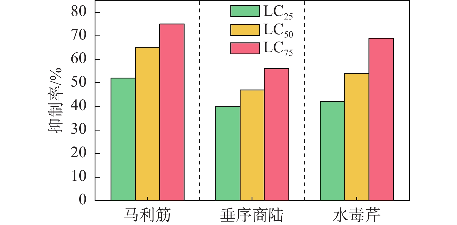 为探究马利筋(Asclepias curassavica L.)、垂序商陆 (Phytolacca acinosa R.) 和水毒芹 (Cicuta virosa L.) 提取物对福寿螺 (Pomacea canaliculata) 的毒杀活性、生理损伤及环境毒性效应, 通过浸杀法系统评估其在不同剂量和处理时间下的毒杀效果, 并检测肝脏关键生理指标变化及水质残毒. 结果表明, 3种植物提取物均呈现剂量-时间依赖性毒杀效果, 其中, 马利筋毒力最强 (48 h亚致死浓度 LC50为0.270 mL/L), 是垂序商陆 (0.819 mL/L) 的3.03倍、水毒芹 (1.071 mL/L) 的3.97倍. 福寿螺肝脏生理指标检测显示, 马利筋和水毒芹诱导的毒性损伤最显著, 总蛋白、丙二醛、过氧化氢酶等反映机体健康状态的物质含量下降, 乙酰胆碱酯酶、谷胱甘肽S-转移酶、丙氨酸氨基转移酶等与肝脏的解毒功能密切相关的酶活性上升. 水质残毒结果显示, 马利筋对发光菌抑制率最高 (LC75浓度下达到75%), 垂序商陆的生态风险最低 (LC75浓度下抑制率为56%). 与传统化学杀螺剂相比, 马利筋和垂序商陆提取物均具有较高的生态安全性, 更适合生态友好型防控应用, 具有作为植物源杀螺剂的开发应用潜力.