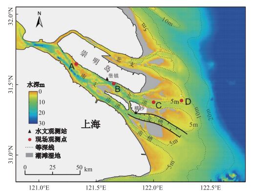 1 研究区概况长江口是典型的分叉型河口, 呈三级分汊、四口入海格局[23].当前长江主流走南支, 北支分流比不到5 %, 近年来甚至不到2 %, 南、北港分流比相近[24-25], 南港水道受人类活动影响较北港大[26].经南、北槽分汊口贯穿南港和北港的横断面是一条分界线, 其向海一侧至大约10m等深线之间的范围因发育拦门沙而成为最大浑浊带[27]; 其向陆一侧至南、北支分汊口之间为口门内河槽.本次现场准同步观测的四个测点位于受到人类活动影响相对较小的南支-北港-口外海滨水域中, 其中A和B两点位于口门内河槽, C和D两点位于口门最大浑浊带(见图 1).