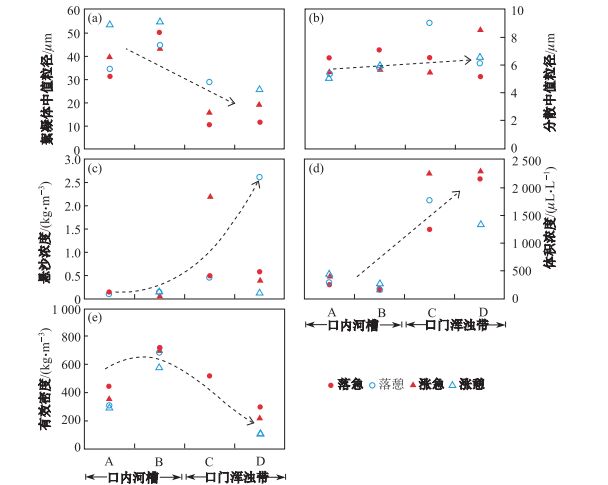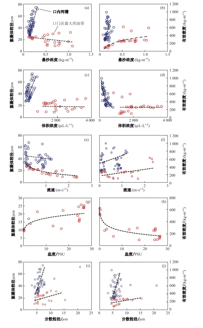 4.2 体积浓度对絮凝的影响随着体积浓度的升高, 絮凝体所占体积变大, 不仅使得空隙中充满更多的低于泥沙密度的水, 使得絮凝体有效密度减小, 还使得絮凝体粒径有增大的可能.在口内河槽, 这一规律得到很好体现(见图 7c和7d), 体积浓度是口内河槽絮凝体粒径的主要控制性因子之一.在口门最大浑浊带, 絮凝体受到水流剪切与盐絮凝等其他作用, 体积浓度的作用不如口内河槽显著(见图 7c和7d).