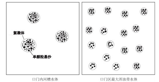 图 5 口内河槽与口门最大浑浊带水体中的絮凝体分布模式 Fig.5 The flocs distribution patternsin the waters between the inner estuary and the Turbidity Maximum Zone of the mouth area |