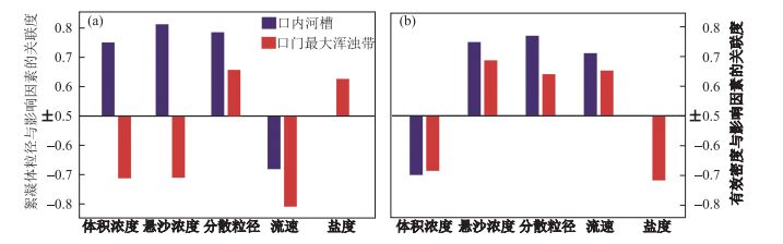 将口内河槽测点与口门最大浑浊带测点的数据序列分别用灰色关联度分析法计算得出关联度如图 6所示.从口内河槽到口门最大浑浊带, 絮凝体粒径和有效密度与其主要影响因子之间的关联度存在较大差异:体积浓度与悬沙浓度的关联度从正相关变为负相关, 分散粒径的关联度显著变小, 流速的影响明显增加.在口内河槽, 影响絮凝体大小的关键因子是悬沙浓度(关联度为0.810)、分散粒径(关联度为0.783) 和体积浓度(关联度为0.748);在口门最大浑浊带, 影响絮凝体大小的控制性因子则变为流速(关联度为-0.807).在口门最大浑浊带, 除盐度外的相关因子与有效密度的关联度都较口内河槽区域降低.口内河槽有效密度主要受到分散粒径(关联度为0.766)、悬沙浓度(关联度为0.745) 与流速(关联度为0.708) 控制; 在口门最大浑浊带有效密度的控制性因子变为盐度(关联度为-0.711) 和悬沙浓度(关联度为0.684).