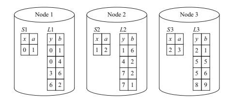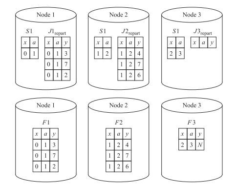 1.3 复制分片分布式外连接算法复制分片分布式连接算法主要分为4步[11].第一步, 将表数据量比较小的表分片发送到其他各个节点上, 使得每一台机器上都由该小表的所有数据.这里使用第1.2节的示例, 图 2所示的结果就是将表