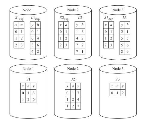 图 2 中文复制分片分布式连接算法的第一步和第二步:数据被复制到其他所有节点上, 并将 |