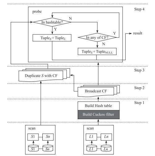 图 4 基于布谷鸟过滤器的分布式外连接算法流程图 Fig.4 The visual presentation of distributed outer join algorithm based on Cuckoo filter |