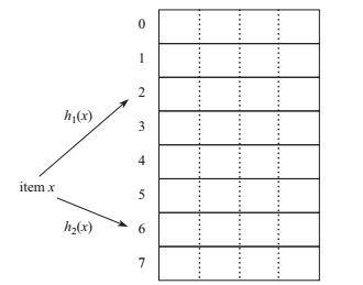 由Cuckoo Hashing的特性可知, 它适合大规模并发的读操作、少量写操作的场景. Bin Fan基于Cuckoo Hashing提出了布谷鸟过滤器, 他首先改进了其空间利用率, 初始Cuckoo Hashing的空间率最高在50%, 通过对每个桶增加槽位(slot)到4个, 使得在其他3路slot没被填满之前, 不会发生元素被踢出的情况, 这很大程度上缓冲了碰撞几率, 如图 6所示.