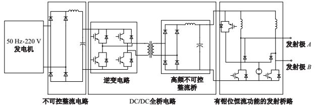 频域电磁探测整流电源设计要求: 交流供电 50 Hz/220 V 单相交流发电机;直流输出电压 200 V; 发射电流幅值 50 A; 最大发射频率 30 kHz.
