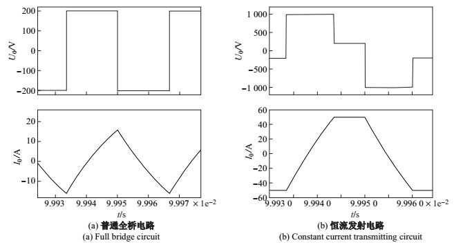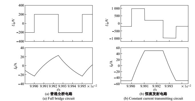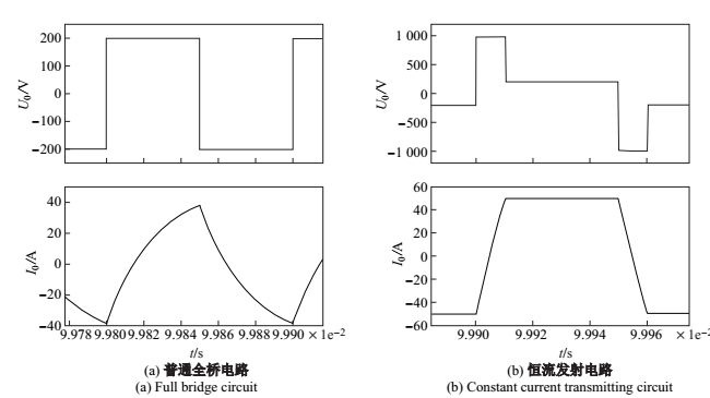 发射子系统拓扑结构如图 8 所示. 在输出 10 kHz 到 30kHz 的交流方波为目标下, 以普通桥式电路的仿真结果与所采用发射电路的仿真结果做比较, 重点分析频域电磁探测发射电路的上升沿波形质量提升与恒流输出功能.