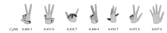 图 12显示的是同一手模型在不同姿势下的凸度.从图中可以看出, 5个手指完全张开时, 凸度值最大.而当手指弯曲的程度越高或弯曲手指越多时, 其凸度值越小, 这与人们心理上对凸度的衡量是一致的.