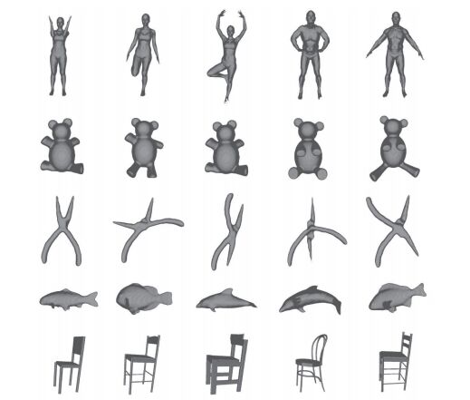 本文从MPI-FAUST、McGill Articulated 3D Shape Benchmark和Princeton Benchmark 数据库中提取了80个网格模型, 共分为5个类别, 图 13显示的是其中的一些样本.我们把模型的凸度作为特征进行了分类实验, 实验采用的