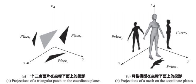 图 3(a)表示网格模型中的一个三角面片在坐标平面上的投影.图 3(b)表示网格模型在三个坐标平面的投影, 即