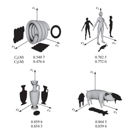 图 4 模型在主方向坐标系下的投影以及C2和Ce的值 Fig.4 Mesh silhouettes along the principal axes with the mesh convexity values calculated by C2 and Ce |