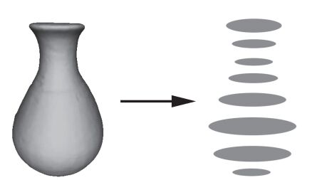 类似于医学上断层扫描的思想, 我们也可以在三个方向对网格模型进行``切片''.如图 6所示, 图中只显示了沿一个方向的切片, 此方向上的切片都是凸的, 但是在另外两个正交方向上存在凹切片.通过切片处理, 一个网格模型被转换为一系列的二维形状, 而这些二维形状的凸度则反映了原始网格的凸度值.因此, 我们使用这些二维形状的凸度值来计算每个主方向的修正系数.