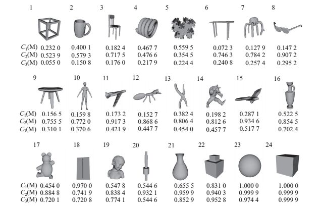 图 9显示的是用不同凸度衡量方法计算出的凸度值, 网格模型按照C3的值进行排序.通过结果可以看出, 本文方法对模型1, 3, 6, 7和8计算的凸度值较低, 相反,C2的值较大.从模型18我们可以看出, 单纯基于体积的方法C1对于细长的凹陷并不敏感, 而C2和C3却能够给出合理的结果.由于公式(14)是一个近似计算, 对于球形模型会产生一个较大的误差, 所以模型23计算出的值并不是完全凸的.