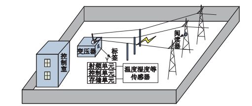1 变电站设备多天线RFID监测系统架构电气设备运行状态直接影响着电气设备运行的安全性与稳定性.不同功能的传感器(温度、湿度、压力、加速度传感器等)与RFID标签融合构成的传感标签具有自动感知和识别能力.将传感标签应用于变电站输变电设备状态信息采集监测系统中, 可以在线采集电气设备运行状态信息及环境信息, 提高监测系统的实时性、准确性以及可靠性.当读写器发出信息获取指令时, 读写器天线有效辐射区域内的传感标签被激活, 将感知的信息(温度、湿度、振动、加速度等)及标签自身信息返回至读写器, 并上传至监控中心, 监控中心人员便可实时监测变电站设备状态及运行状况.本文以变电站设备温度监测为例, 系统架构如图 1所示.