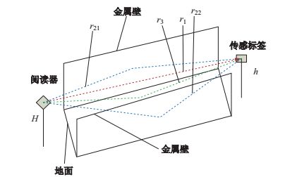 电磁波在U形通道中, 会在地面、金属壁侧面发生一次或多次反射和绕射.RFID系统最大允许发射功率非常小, 考虑传播路径损耗, 二次及多次反射波通常非常微弱; 同时, 电磁波通过粗燥金属表面时会发生散射现象, 电磁信号强度急剧下降.因此, 本文忽略两次及两次以上的电磁波反射.U形通道中的电磁波传播情况如图 2所示, 其中,