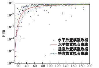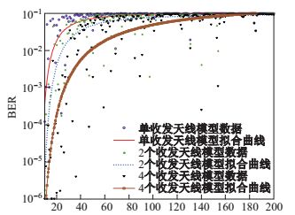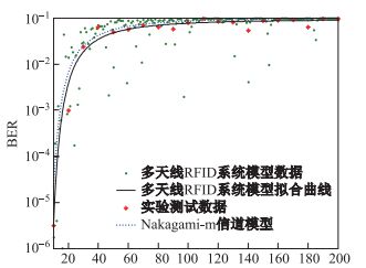 多收发天线RFID系统与单天线RFID系统误码率对比如图 6所示.由图 6可知, 采用多天线后, 天线数目越多, 系统的误码率越小; 在0~80m范围内, 相比双天线和单天线RFID系统, 4天线RFID系统误码率降低约1至3个数量级, 系统误码率得到明显降低.随着阅读器与传感标签间距离增大, 不同数目天线间的RFID系统误码率差距逐渐减小.当阅读器识别距离大于150 m时, 阅读器接收天线数量增加对提高系统误码率的效果并不明显.