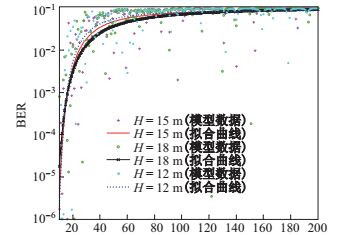 变电站多天线RFID监测系统误码率与阅读器天线高度的关系如图 7所示.由《35 kV~220 kV送电线路铁塔通用设计型录》可知, 铁塔高度(铁塔上最低处电力线距地面的高度)一般分为12 m、15 m、18m、21m和24 m几个等级.假设电力线路呈正三角形分布, 考虑到铁塔最低高度电线距铁塔中心线距离为2.3~2.8 m, 此处取2.5 m, 阅读器距离最低处电力线安全距离为5 m(预留一定安全裕度)[17], 可得阅读器天线距地面高度为18.67 m.为便于分析, 本文设定阅读器天线距地面高度为18 m、15 m和12 m.由图 7可知, 阅读器天线高度越高, 系统的误码率越小.当阅读器天线高度增加时, 由于反射信号的传播距离较直射信号传播距离远, 其路径传播损耗大, 从而多径效应产生的信号干扰程度减弱, 使得接收信号中有用信号的相对强度增大, 误码率随之减小.