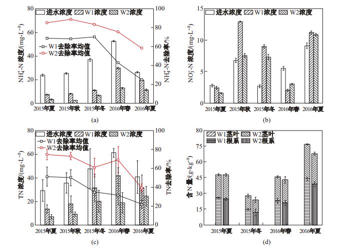 2 结果与分析 2.1 湿地对污水中NH为评价2种垂直流人工湿地系统的实际运行效果, 本文将试验运行按照季节分为5个阶段, 分别是: 2015年夏、2015年秋、2015年冬、2016年春及2016年夏.图 2(a)展示了湿地系统各阶段的NH