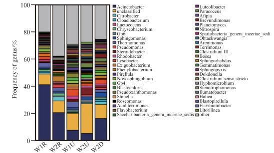 为了揭示填料及植物根系样品中微生物的菌群结构, 将97%相似水平的OTU代表序列在属水平上进行分类统计.通过图 3可知W1和W2的5个样本列出了50个属类, 包括不动杆菌属(Acinetobacter)、柠檬酸杆菌属(Citrobacter)、黄杆菌属(Cloacibacterium)、乳球菌属(Lactococcus)、产吲哚金黄杆菌(Chryseobacterium)等.其中, 不动杆菌属(Acinetobacter)是5个样品中的优势菌种.已有研究表明, 不动杆菌属(Acinetobacter)可进行"好氧反硝化"作用[25].由图 3可知, 不动杆菌属(Acinetobacter)在W1R中的占比明显高于W2R, 表明W1的植物根系中含有比例更高的"好氧反硝化"相关菌种.这可能是因为W1的陶粒层较厚且陶粒孔隙率较大, 更有利于植物根系生长.不动杆菌属(Acinetobacter)在W1U和W2U中的占比在5个微生物样品中最低, 而在W1D中的占比则较高, 这表明该菌属更容易在沸石表面生长.因此, 沸石填料的加入有利于垂直流人工湿地中"好氧反硝化"相关菌种的富集.