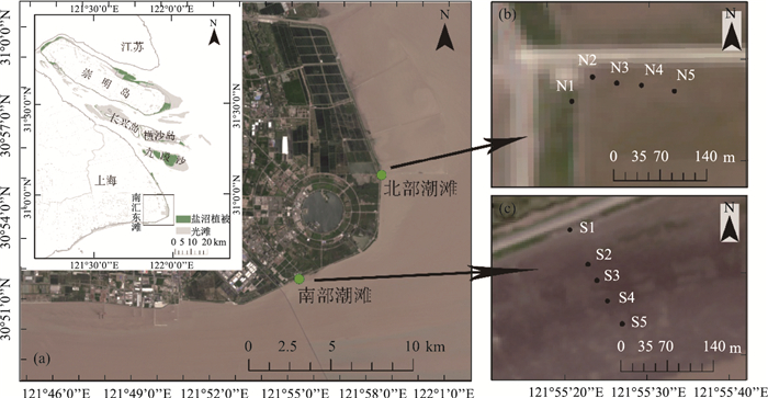 注: N1——N5为北部潮滩移栽样点; S1——S5为南部潮滩移栽样点 图 1 研究区域位置图(a), 北部潮滩移栽样点示意图(b), 南部潮滩移栽样点示意图(c) Fig.1 Map of the study area (a), schematic diagram of the sampling sites on the northern tidal flat (b) and on the southern tidal flat (c) |