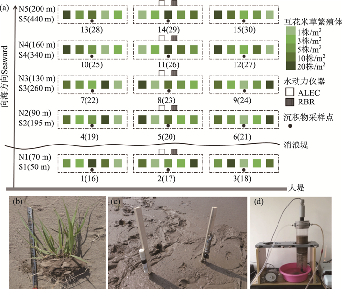 注: 1——15为北部潮滩移栽样方, (16)——(30)为南部潮滩移栽样方, N1(70 m)表示N1样点距大堤距离为70 m, S1(50 m)表示S1样点距大堤距离为50m, 其余以此类推 图 2 样点布设示意图(a), 移栽的互花米草根茎苗(b), ALEC及RBR仪器架设现场图(c), 沉积物临界剪切应力测定的实验过程图(d) Fig.2 Schematic diagram of a sample layout (a), transplant of S. alterniflora rhizomes (b), the typical setup of ALEC and RBR instruments (c), and experimental setup for measurement of sediment critical shear stress (d) |