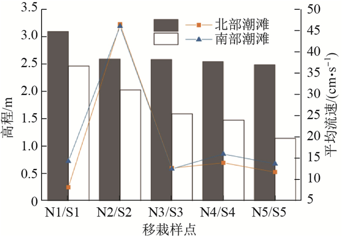 (2) 沉积物临界剪切应力测定 参照Xu等[29]的方法, 使用10 cm直径玻璃管采集表层20 cm沉积物样品, 上下两侧加保鲜膜和PVC管帽密封, 带回实验室使用U-GEMS微观侵蚀系统测量北部潮滩和南部潮滩各移栽样点沉积物的临界剪切应力.