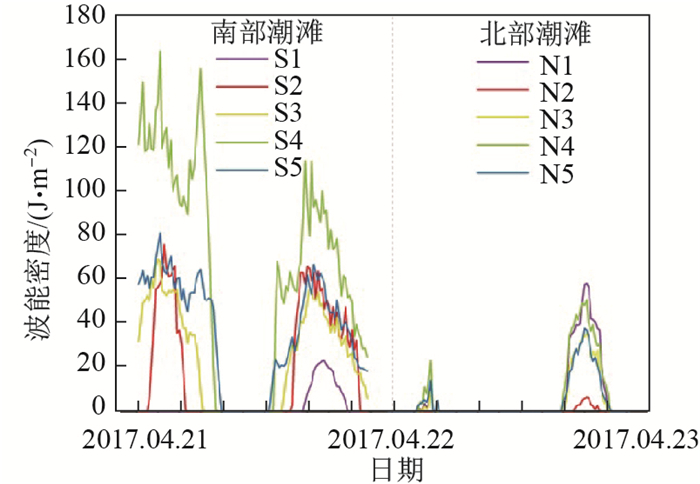 3 结果分析 3.1 南汇东滩自然潮滩环境特征南汇北部潮滩及南部潮滩的地形高程均呈现由陆向海逐渐降低的趋势, 但南部潮滩的高程显著低于北部潮滩(见图 3, P < 0.05).南北部潮滩平均流速无显著差异(P>0.05)(见图 3), 消浪堤外第一个样点(N2和S2)的流速均显著高于其他样点(P < 0.05).此外, 由图 4可知, 南部潮滩的波能密度大于北部潮滩(P < 0.05).