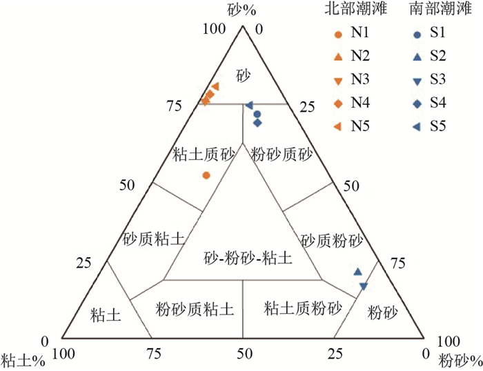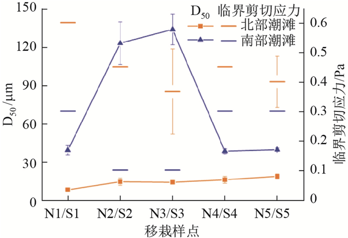 由图 5和图 6可知, 北部潮滩沉积物中值粒径(median diameter, D50)变化范围为6.5~ 20.3μm, 底质为砂和粘土质砂, 属于砂质潮滩; 南部潮滩沉积物D50变化范围为36.2~ 147.0μm, 底质为粉砂质砂和砂质粉砂, 属于粉砂质潮滩.南部潮滩所有样点的沉积物D50均显著高于北部潮滩(见图 6, P < 0.05).在北部潮滩, 消浪堤内(N1)的沉积物D50与消浪堤外的样点(N2——N5)有显著差异(P < 0.05), 在分类上消浪堤内的沉积物属于粘土质砂, 而消浪堤外的属于砂(见图 5).在南部潮滩上, S2、S3处的沉积物D50高于其他样点(见图 6, P < 0.05), 在分类上这两个点的沉积物属于砂质粉砂, 而南部潮滩其他样点的沉积物属于粉砂质砂(见图 5).南部潮滩的临界剪切应力显著低于北部潮滩(见图 6, P < 0.05), 表明北部潮滩滩面的抗侵蚀能力高于南部潮滩.综合来看, 南汇东滩的南部潮滩沉积物异质性较强, 更易受到侵蚀.