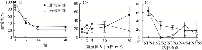 注: (a)互花米草根茎苗存活率随天数的变化, (b)互花米草根茎苗存活率随繁殖体大小的变化, (c)互花米草根茎苗存活率随环境梯度的变化 图 7 北部潮滩及南部潮滩互花米草根茎苗存活率 Fig.7 The survival rate of S. alterniflora rhizomes in the northern and southern tidal flats |
