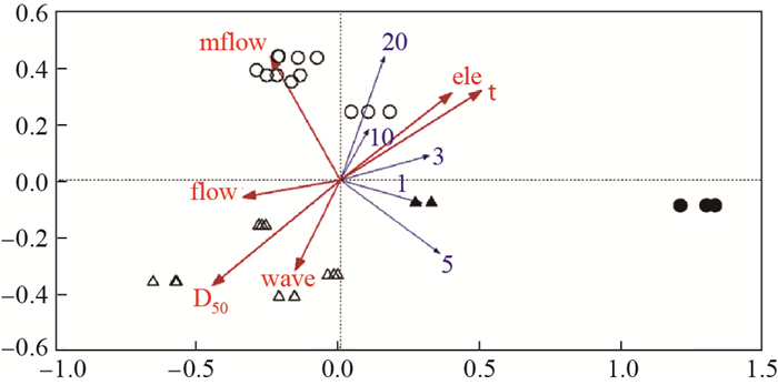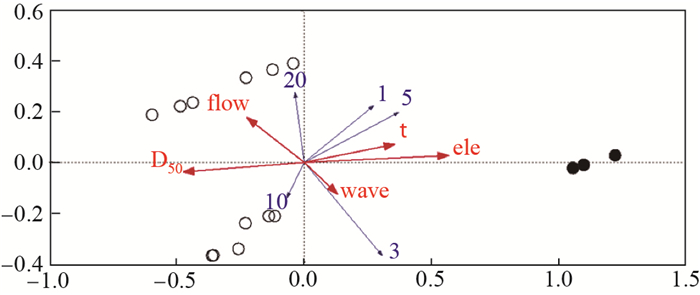 利用Canoco4.5软件RDA分析方法研究潮滩环境因子对互花米草根茎苗定植的相对重要性[30-31].以互花米草繁殖体的存活率指标作为生物变量, 以高程(elevation, ele)、平均流速(mean flow velocity, flow)、最大流速(maximum flow velocity, mflow)、平均波能密度(mean wave energy, wave)、最大波能密度(maximum wave energy, mwave)、临界剪切应力(critical shear stress, τ)和中值粒径(median diameter, D50)作为环境变量.所有环境变量均经过log(1+x)转换以消除量纲的影响.分析过程中, 剔除解释量低且膨胀因子(Variance Inflation Factor, VIF)大于20的环境变量, 使用Manual Selection分析环境因子对生物变量的影响, 并通过蒙特卡罗检验得到环境因子的重要性排序.