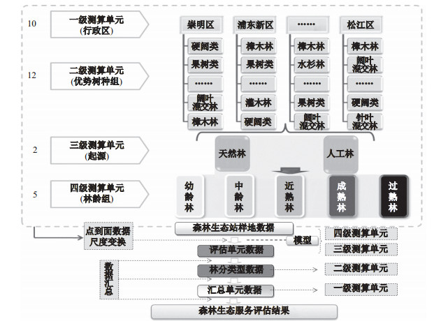 2.3 测算方法为了最大限度考虑不同生态功能区森林生态系统空间和时间上的差异性, 森林生态连续观测与清查体系引入了分布式测算模型[16-18].本评估也是基于分布式测算方法(见图 1), 具体测算过程如下: ①首先将上海市按行政区划分为中心城区(包括黄浦区、徐汇区、长宁区、静安区、普陀区、虹口区和杨浦区)、闵行区、嘉定区、宝山区、浦东新区、奉贤区、松江区、金山区、青浦区以及崇明区等10个一级测算单元; ②每个一级测算单元又按不同优势树种(组), 划分成樟木林、水杉林、硬阔类、阔叶混交林、灌木林、果树类、软阔类、针阔混交林、杉类、竹林、松类和针叶混交林等12个二级测算单元; ③每个二级测算单元按照不同起源, 划分为天然林和人工林2个三级测算单元; ④每个三级测算单元再按龄组, 划分为幼龄林、中龄林、近熟林、成熟林和过熟林5个四级测算单元; ⑤再结合不同立地条件的对比观测, 最终确定了1 200个相对均质化的生态服务功能评估单元[19].