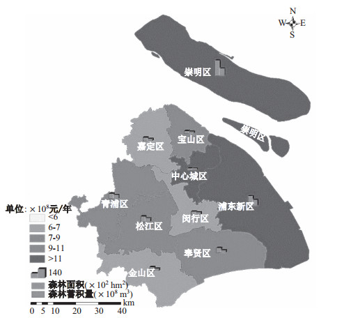 (3) 上海市各区森林生态系统服务功能价值量的分布格局, 与各区森林资源自身的属性有直接的关系.森林生态系统服务功能价值从大到小的分别为:中心城区>浦东新区>崇明区>松江区>青浦区>奉贤区>宝山区>嘉定区>闵行区>金山区.中心城区森林资源总量虽然不大, 但是森林生态系统服务功能价值却最高, 这与中心城区森林游憩功能有关.中心城区森林生态系统服务总价值为25.49亿元, 其中森林游憩功能价值量为21.68亿元, 占85.05%.除中心城区外, 9个郊区森林生态系统服务功能价值的大小顺序与森林面积大小顺序大体一致, 呈紧密的正相关性.上海市森林面积在各区的分布差异很大, 郊区森林面积大, 而城区森林面积小. 2016年上海市各区森林面积从大到小为:崇明区(27.54%)、浦东新区(17.98%)、松江区(9.58%)、青浦区(9.20%)、奉贤区(8.70%)、金山区(6.78%)、嘉定区(6.36%)、闵行区(6.01%)、宝山区(4.72%)、中心城区(3.12%).浦东新区和崇明区的森林资源面积在全市各区中排前两位, 由此所产生的森林生态系统服务功能价值量也在前列, 为全市带来了巨大的生态效益.