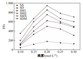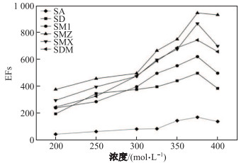 图 5 浓度对富集倍数的影响 Fig.5 Effect of the concentration of Na2SO4 on EFs of six sulfonamide compounds |