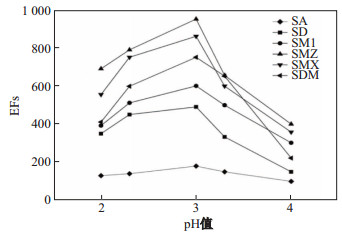 由于盐析效应会降低待测物质在样品中的溶解度, 从而提高它们在萃取相中的分配, 进而提高萃取效率, 所以向样品溶液中加入一些无机盐, 例如Na2SO4等, 可以增强溶液的离子强度.在200~ 400 g/L范围内考察了Na2SO4浓度对萃取的影响.如图 5所示, 6种磺胺类抗生素的EFs随着给出相中的Na2SO4浓度的增加而增大.当Na2SO4浓度大于375 g/L时, 除了SMZ其他5种抗生素的EFs呈下降趋势.可能的原因是盐浓度过高导致抗生素分子通过膜进入有机相的速率降低, 从而不利于萃取.因此, 最后选择在样品溶液中加入浓度为375 g/L的Na2SO4来提高萃取效率.
