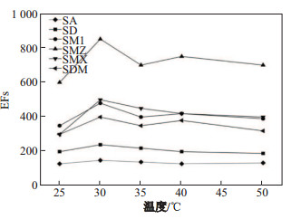 图 6 温度对富集倍数的影响 Fig.6 Effect of the extraction temperature on EFs of six sulfonamide compounds |