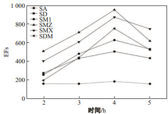 在动态的三相HF-LPME中, 待萃取物进入接收相溶液中的量随着萃取时间的延长而增加, 直至在某一平衡点达到最大值.本实验考察了萃取时间分别为2, 3, 4和5 h时, 6种磺胺类抗生素萃取效率的变化.根据实验结果图 7, 可以看出, 所有物质的EFs都随着萃取时间的延长而增大, 然而, 当时间超过4 h时, 回收的接收相溶液体积明显减少, 而且EFs明显减少.综合考虑到在平衡后继续延长萃取的时间会导致SLM的不稳定性从而导致萃取效率的降低以及萃取溶液的减少, 选择4 h作为最佳萃取时间.