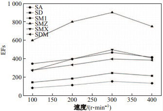 图 8 搅拌速度对富集倍数的影响 Fig.8 Effect of the stirring rate on EFs of six sulfonamide compounds |