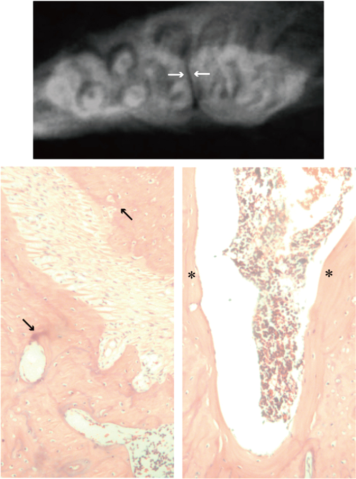 注:白色箭头表示磨牙之间的齿间距; 黑色箭头指示炎性细胞浸涧; *表示釉牙骨质界