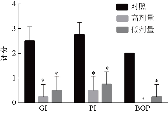 GI、PI和BOP的基线均为3, 经过不同剂量IgY给药4周后, 各组GI、PI和BOP均有所下降(见图 2), 但治疗组显著低于对照组(