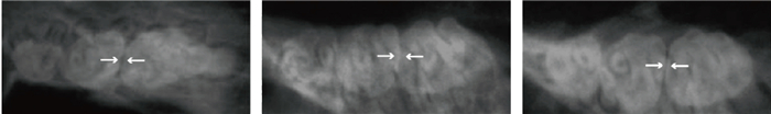 注:白色箭头表示磨牙之间的齿间距 图 4 大鼠上颌牙周组织的X-射线影像 Fig.4 X-ray of periodontium in a rat upper jaw |