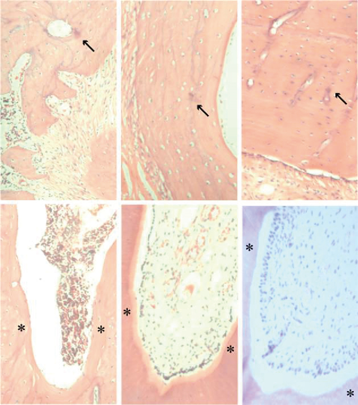 建模28 d, 肉眼观察26只大鼠, 可见牙龈有明显的红肿, 第二磨牙有软垢附着并伴有自动出血症状, 大鼠的平均牙龈指数为3, 菌斑指数为3, 探诊出血指数为3.处死2只大鼠观察, 结果如图 1所示.上方为X-射线影像; 下方左边为牙周组织; 右边为牙槽骨; 图中白色箭头表示磨牙之间的齿间距; 黑色箭头指示炎性细胞浸润; *表示釉牙骨质界(cemento-enamel junction, CEJ). X射线影像显示牙周炎大鼠上颌第二磨牙与相邻牙齿之间有较大缝隙, 并且牙齿与牙槽间隙明显, 可能是大鼠形成牙周袋造成的; 病理切片显示牙周纤维有大量炎症细胞浸润, 胶原纤维束排列紊乱, 同时伴有牙槽骨吸收, 因此判定为造模成功[13].