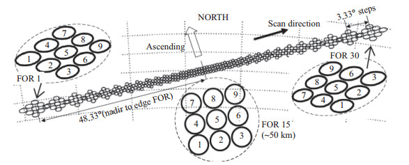 1 数据与处理 1.1 CrIS数据2011年10月28日, 美国对地观测卫星系统Suomi NPP(national polar-orbiting partnership)成功发射升空. CrIS是搭载于该卫星系统平台上的高光谱红外探测仪, 其提供了1 305个光谱通道, 分别覆盖了长波红外、中波红外以及短波红外三个波段范围.图 1为高光谱红外探测仪CrIS观测方式的空间分辨率图(来自CrIS-SDR用户手册[13]), 每个能视域FOR(Field of Regard)包含了3