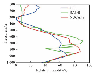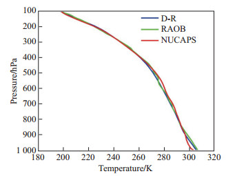 (2) NUCAPS采用微波数据进行云检测, 因此提供了云下的信息, 这使得能较为准确地反演多云天气条件下的廓线.而D-R算法反演得到的是云以上部分的廓线以及浅薄云层下的廓线, 无法很好地反演得到深厚云层下的廓线.