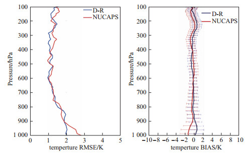3.2 温湿度廓线反演的统计分析为了进一步检验D-R算法和NUCAPS算法的精度, 利用D-R算法基于表 2中的背景场反演了2014—2016年6—9月晴空条件下的117组大气温湿度廓线, 并以实测探空资料为真值进行了对比, 分别计算了D-R算法和NUCAPS算法反演的温湿度廓线的均方根误差RMSE与偏差BIAS.均方根误差RMSE与偏差BIAS计算公式如下: