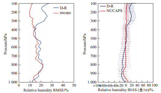 图 6给出了各个气压层上统计的D-R算法和NUCAPS算法反演的晴空大气相对湿度廓线与实测探空大气相对湿度廓线之间的RMSE和BIAS, 图 6(b)中的误差线为两种反演算法在各层统计的标准差.从图 6(a)中可以看出, D-R算法和NUCAPS算法反演得到的相对湿度廓线精度都较高, 整层平均RMSE分别为19.78%(D-R)和14.04%(NUCAPS), 相对而言NUCAPS算法反演得到的相对湿度廓线精度要稍高一些.在中低层(300 hPa以下)部分, 两种算法得到的相对湿度廓线精度相当, 其RMSE基本都在20%以内, 精度最高的部分RMSE能达到10%.在高层(300 hPa以上)部分, D-R算法反演得到的相对湿度廓线的RMSE明显增大但仍能控制在30%以内. Sun B等[10]的研究结果表明, 与探空资料对比, 全球范围NUCAPS反演的湿度廓线在400 hPa以下时RMSE在20%以内, 但在400 hPa以上时RMSE同样明显增大; Nalli N R等[14]也得到了类似结论.造成这一现象的原因是由于高层水汽较少, 探空资料的观测数据不够准确, 往往测得的水汽数据与实际相比偏小[10].从图 6(b)中可以看出两种算法反演的相对湿度廓线在中低层(300 hPa以下)部分都较稳定, 其BIAS基本都保持在