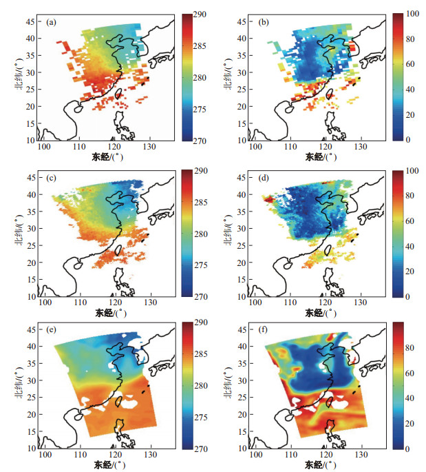 图 7为700 hPa高度层上NUCAPS算法(见图 7a、图 7b)和D-R算法(见图 7c、图 7d)分别反演的温湿度和ECMWF再分析资料(图 7e、图 7f)的空间分布图.由图 7可知, 由于D-R算法基于卫星单个视场角的辐射观测资料进行温湿度的反演, 相比较NUCAPS算法而言, 有着更高的空间分辨率, 能够刻画出更为细致的温湿度空间分布特征.而且从温度对比图图 7a和图 7c中也可以看出, 与ECMWF的温度图像(见图 7e)对比, D-R算法反演得到的温度空间分布与ECMWF结果更接近.这说明利用D-R算法反演的结果比NUCAPS算法在空间的分布上更好, 反演的精度更高.从湿度对比图(见图 7b、图 7d、图 7f)中可以看出, 两种算法反演的相对湿度精度相当, 但D-R算法给了更多的细节信息.这说明D-R算法提供的大气温湿度资料既具有较高的空间分辨率, 还保持了较高的反演精度, 可以为物理反演方法、数值模式、数据同化等研究领域提供很好的初始廓线.
