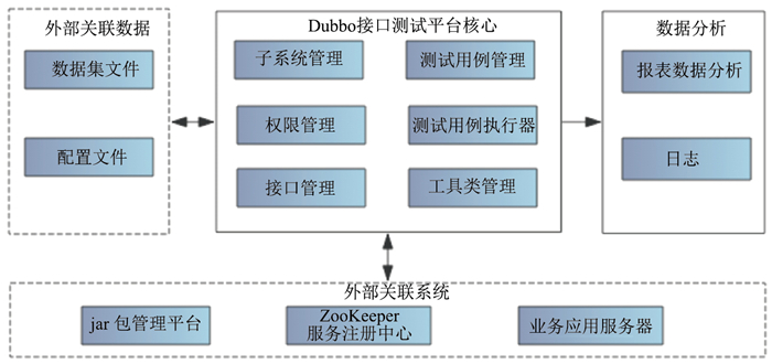 与外部数据相关的两个模块为外部关联数据和外部关联系统.外部关联数据模块包括数据集文件和配置文件.基于数据驱动的思想, 一个测试用例可以对应多条测试数据, 测试人员可以在excel编辑需要的测试数据集.测试用例中的数据参数化支持, 除了可以使用数据集的数据, 还可以使用配置文件中的数据.数据集和配置文件的数据都通过Dubbo接口测试平台核心模块进行导入和导出.外部关联系统主要包括jar包管理平台、ZooKeeper服务注册中心、业务应用服务器. jar包管理平台通过maven私服搭建, 测试文件都存储在平台上, 通过配置maven的GAV(GroupId, ArtifactId, Version)信息, 新平台核心模块自动下载待测包. ZooKeeper服务注册中心通过ZooKeeper统一管理业务服务.接口测试平台核心模块通过ZooKeeper服务中心获取业务服务列表并发送服务调用请求至业务应用服务器, 并获取服务响应数据.