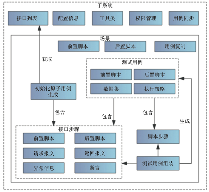 2.1 用例管理用例管理模块的架构图如图 2所示.用例管理中, 测试用例以子系统分类, 分别对应不同的权限, 包括用例的新、增、改及执行等权限.接口列表、配置信息、工具类都是子系统级.根据待测试功能进行分类, 一个子系统的测试用例分为多个场景, 一个场景下又有多条测试用例.