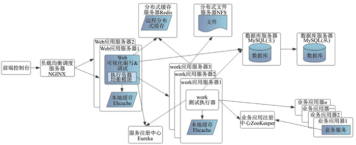 由于接口测试用例数量也很多, 同一时间并发请求数也会很多, 这对缓存访问有很高的要求; 并且根据执行的负载均衡策略, 同一个应用的测试用例会分配在同一台work执行器上, 新平台会把测试用例执行的上下文信息存储在本地缓存服务Ehcache[24]上, 以提高执行速度.而用户登陆信息及执行中使用到的Dubbo服务信息是存储在缓存服务器Redis[25]上, 并根据负载均衡策略从work执行器集群中选择一台进行执行, work执行器从ZooKeeper注册中心选择可用的业务服务器, 发请求给业务服务并获取响应结果.测试用例的数据保存在数据库中, 数据库使用MySQL, 一主一从.新平台中所有文件都保存在分布式文件服务器NFS上.