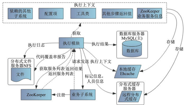 在执行用例之前, 需要获取执行的准备信息, 即执行上下文信息, 包括依赖的其他子系统、配置项信息、使用的工具类中的方法、其他步骤的返回值及ZooKeeper中注册的Dubbo服务信息.针对Dubbo请求, 需要从ZooKeeper中获取注册的服务信息, 有了这些信息, 用例才能执行.由于自动化测试用例数量很多, 同一时间并发请求数也会很多, 则执行上下文会存储在本地缓存服务Ehcache上, 执行中用到的标记信息及测试人员登陆信息存储在缓存服务器Redis上.用例执行会发请求给业务子系统, 然后根据执行情况生成对应的日志, 执行日志及生成的代码覆盖率报告存储在NFS服务器上.对于执行结果, 包括返回报文和执行成功率及代码覆盖率数据会存储在数据库中.可以通过手动触发或通过定时调度方式来执行单个子系统单个版本的所有测试用例, 并生成日志报告及执行报告和代码覆盖率报告.用例执行报告包括测试用例总数、测试步骤数、测试用例成功数、成功率、失败数、失败原因分析和失败用例详情.可以通过页面方式点击方式来查看失败的测试用例及失败详情, 并可定位到失败的步骤.测试用例级别的执行会同时执行测试用例下的所有步骤, 并生成日志.测试步骤级别的执行支持单个步骤的执行, 并支持步骤间上下文的串联.在调试测试用例过程中, 可以仅执行单个步骤来查看结果, 而不用执行所有的步骤, 极大地节省了测试用例的调试时间.